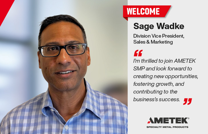 AMETEK Specialty Metal Products (SMP) is pleased to announce the appointment of Sage Wadke as Division Vice President of Sales and Marketing for the Components, Strip, and Wire Businesses.